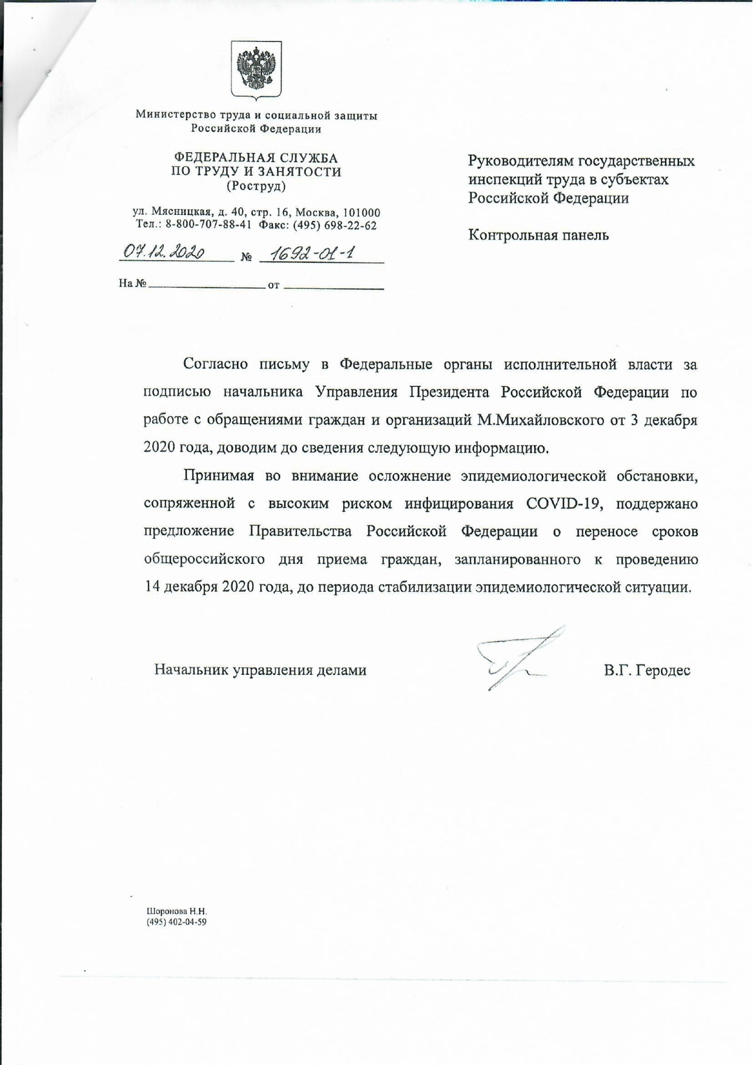 О переносе сроков общероссийского дня приема граждан, запланированного к проведению 14 декабря 2020 года.